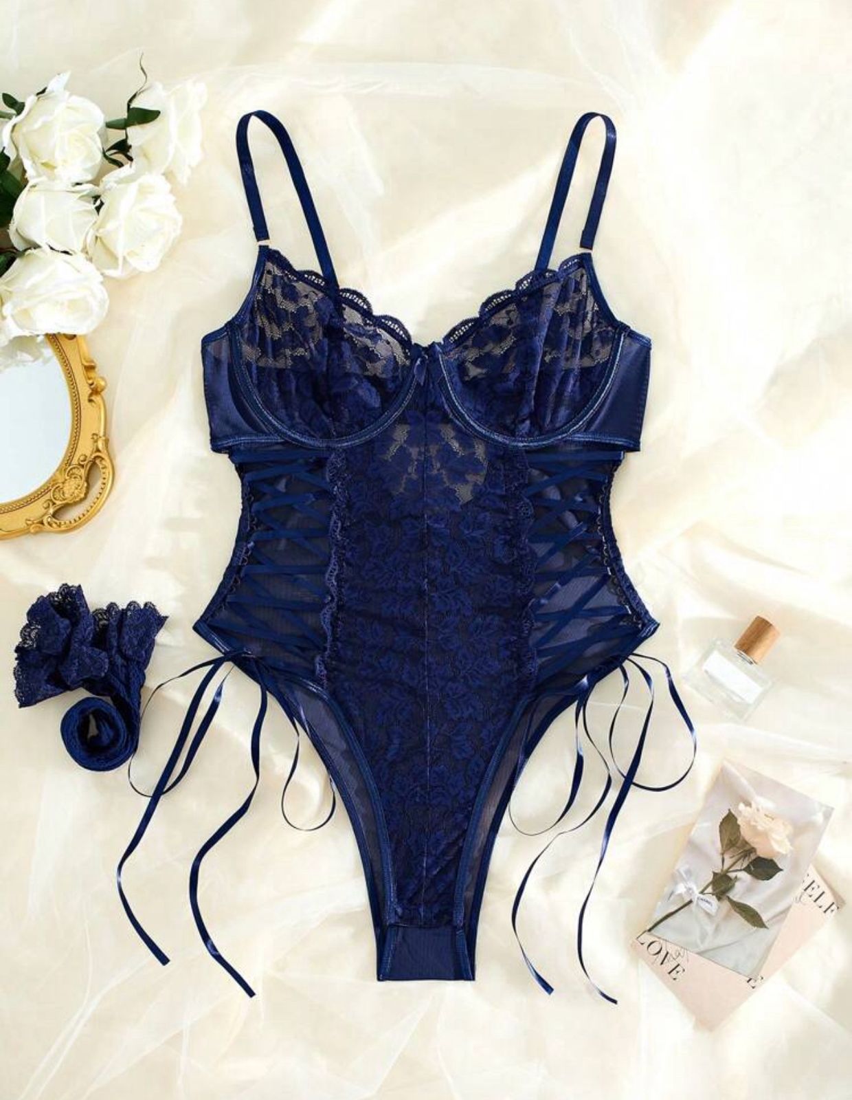 Incluye las medias azules a juego, que completan el look con un aire de sofisticación irresistible. Además, el broche inferior facilita su apertura desde la parte íntima, brindando practicidad sin perder elegancia.